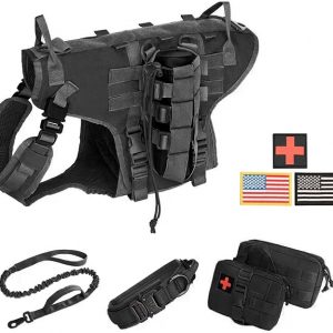 Tactical Dog Vest Harness and Training Dog Collar with Bungee Dog Leash Set No Pull Military Dog Harness with 2 Detachable and 1 Water Bottle Pouches for Outdoor Training Service, Black L