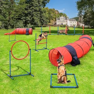 YITAHOME Dog Agility Training Equipment Set with 2 Flexible Tunnels, 2 Hurdles, Jump Ring, 6 Weave Poles, Pause Platform, Teaser Pole, 3 Flying Discs, and Carry Bags for Indoors Outdoors, Orange/Blue