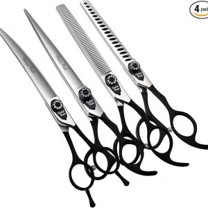 Fenice Peak 7.5” Professional Dog Grooming Scissors Set with Black Non-Slip Handle 440C Stainless Steel Straight Thinning Curved Chunker Shears 4pcs Set for Pet Grooming Services