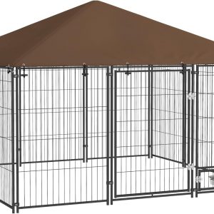 PawHut Outside Dog Kennel, 7′ x 7′ x 5′ Puppy Play Pen with Canopy, Garden Playpen Fence Crate Enclosure Cage Rotating Bowl, for Dogs, Chickens, Ducks, Black