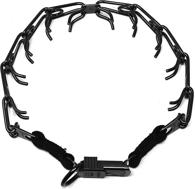 - Black Stainless Steel Prong Collar with Quick Release Buckle: This model comes with ClicLock quick release buckle which makes putting collar on and removing it a breeze; Large Size 4mm x 24 inches overall collar length