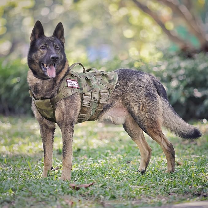 • 【 MOLLE /PALS SYSTEM】Laser cut MOLLE system on the Hook and Loop back panel ,allow your dog to carry gear in training. A wide range of use for personal service, law enforcement, hunting, or outdoor recreation. you can also hook dog bowl, water bottle , toys,ID Badge and patches (No included).