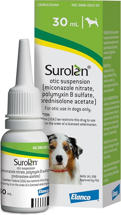 - Surolan is indicated for the treatment of canine otitis externa associated with susceptible strains of yeast (Malassezia pachydermatis) and bacteria (Staphylococcus pseudintermedius)